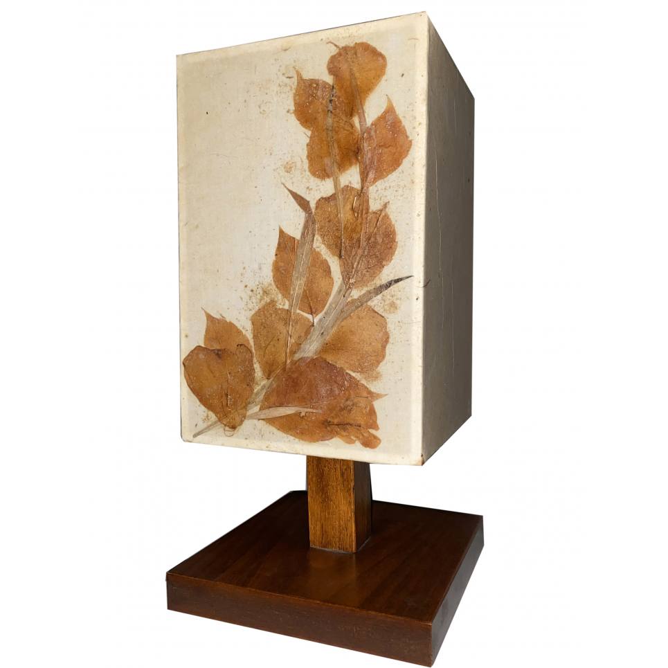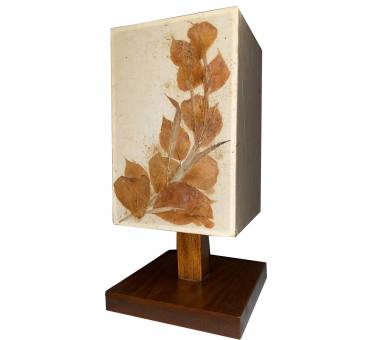 Μοναδικό χειροποίητο επιτραπέζιο φωτιστικό, με βάση από ξύλο και αμπαζούρ από ρυζόχαρτο, φιλοτεχνιμένο με φύλλα αποξηραμένα σε σχήμα κλαδιού.