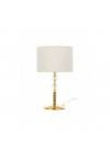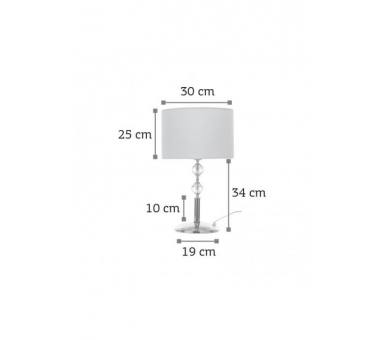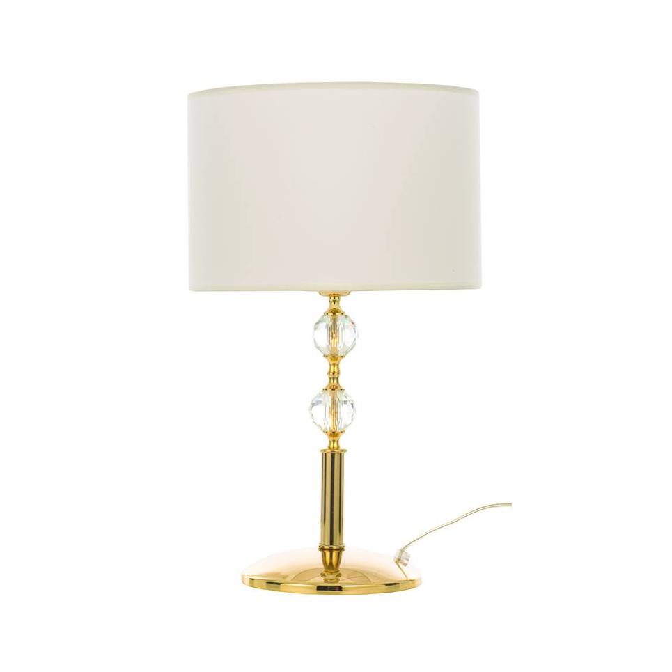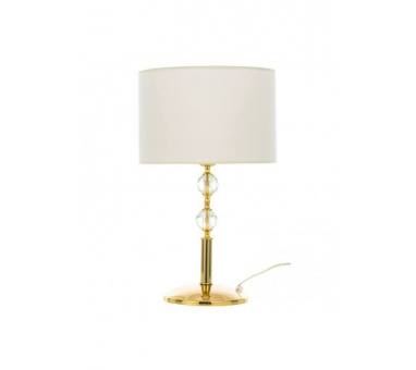 Πρόκειται για ένα χρυσό μεταλλικό επιτραπέζιο φωτιστικό με λευκό υφασμάτινο καπέλο. Τη λιτή του σχεδίαση συμπληρώνουν οι δύο διάφανοι κρύσταλλοι που του δίνουν μια επιπλέον λάμψη.
