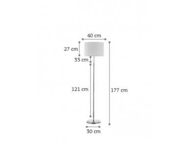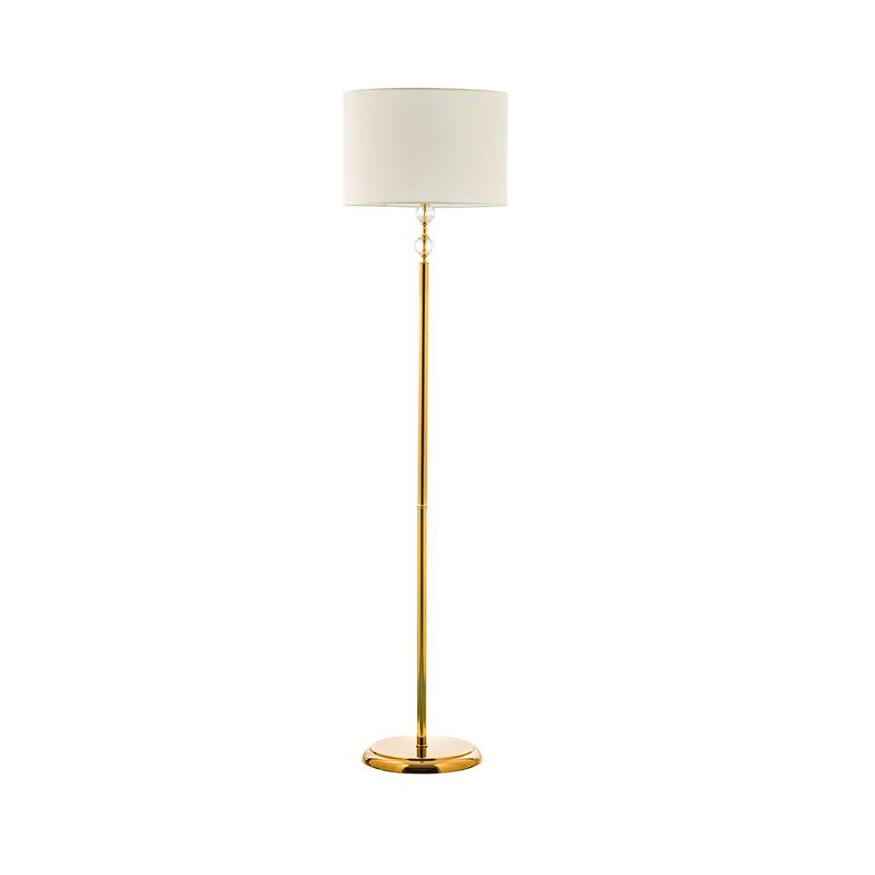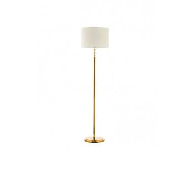 Πρόκειται για ένα χρυσό μεταλλικό επιδαπέδιο φωτιστικό με λευκό υφασμάτινο καπέλο. Τη λιτή του σχεδίαση συμπληρώνουν οι δύο διάφανοι κρύσταλλοι που του δίνουν μια επιπλέον λάμψη.