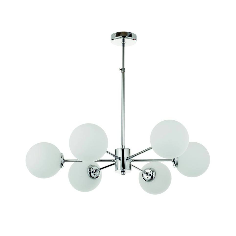 Πρόκειται για ένα χρώμιο μεταλλικό φωτιστικό με λευκή οπαλίνα στο τελείωμα και έξι λαμπτήρες. Η μίνιμαλ σχεδίασή του το τοποθετεί ιδανικά σε οποιονδήποτε μοντέρνο εσωτερικό χώρο. Η ανάρτησή του είναι μεταλλική και ρυθμιζόμενη ώστε να προσαρμοστεί ιδανικά στον χώρο τοποθέτησής του.