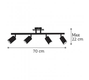 Πρόκειται για ένα μεταλλικό σποτ σε μαύρη απόχρωση με τέσσερις λαμπτήρες. Το μεταλλικό καπάκι μπροστινό του μέρος κινείται προς οποιαδήποτε κατεύθυνση. Τοποθετείται και στην οροφή και στον τοίχο!
