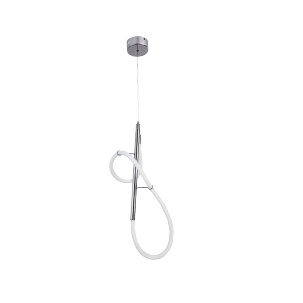 Πρόκειται για ένα κρεμαστό φωτιστικό με αφαιρετική σχεδίαση. Το χρώμιο μέταλλο συμπληρώνει τον led φωτιζόμενο και εύκαμπτο σωλήνα θερμής απόχρωσης. Το φως διαχέεται σε όλον τον χώρο και η ανάρτησή του είναι ρυθμιζόμενη. Διακοσμεί ιδανικά οποιονδήποτε μοντέρνο εσωτερικό χώρο.
