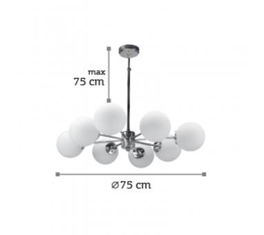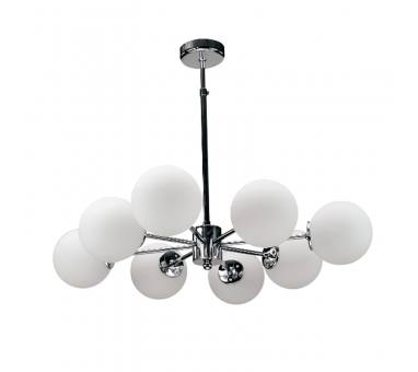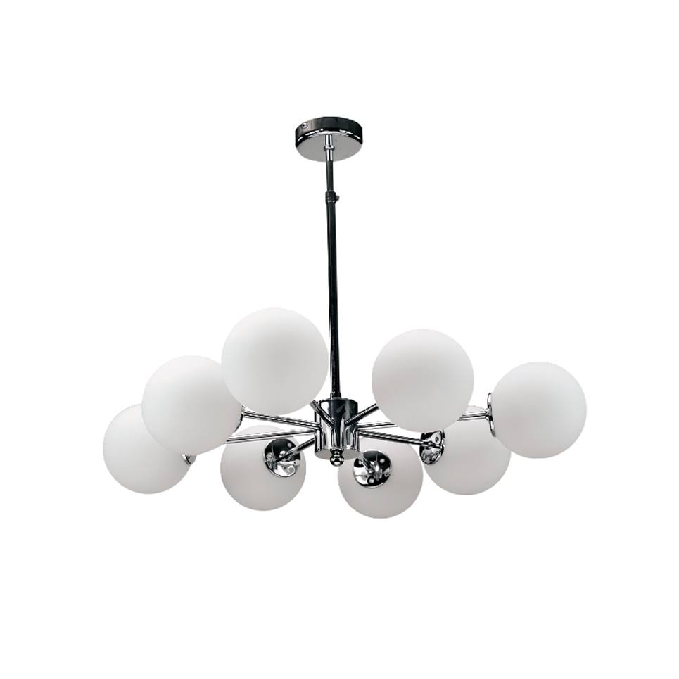 Πρόκειται για ένα χρώμιο μεταλλικό φωτιστικό με λευκή οπαλίνα στο τελείωμα και οχτώ λαμπτήρες. Η μίνιμαλ σχεδίασή του το τοποθετεί ιδανικά σε οποιονδήποτε μοντέρνο εσωτερικό χώρο. Η ανάρτησή του είναι μεταλλική και ρυθμιζόμενη ώστε να προσαρμοστεί ιδανικά στον χώρο τοποθέτησής του.