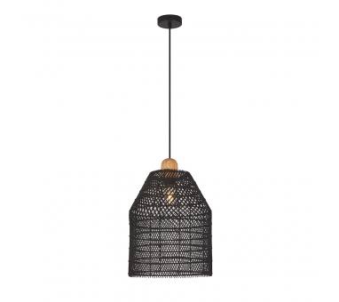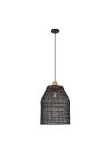 Κρεμαστό μονόφωτο φωτιστικό κατασκευασμένο από Rattan σε μαύρο χρώμα, με ξύλινα στοιχεία και μαύρη μεταλλική βάση.