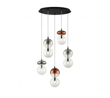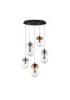 Πολύφωτο-κρεμαστό φωτιστικό, πεντάφωτη ροζέτα, κατασκευασμένο από χειροποίητα γυαλιά σε σε απόχρωση διάφανου, χρωμίου και χαλκού με μαύρα μεταλλικά στοιχεία.