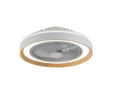 Ανεμιστήρας οροφής με φως και DC μοτέρ για αθόρυβη λειτουργεία. Διαθέτει τηλεχειριστήριο και ενσωματωμένο ανεμιστήρα στο κέντρο. Η βάση είναι από αλουμίνιο, σε λευκό χρώμα, ενώ η πλαφονιέρα είναι από PC σε λευκό χρώμα. Τα πτερύγια είναι ακρυλικά σε διάφανο χρώμα και βρίσκονται στο εσωτερικό του ανεμιστήρα.Διαθέτει έξι ταχύτητες, χρονοδιακόπτη και ταυτόχρονα παρέχει την δυνατότητα εναλλαγής θερμοκρασίας χρώματος σε όλο το φάσμα από 3000K-6000Κ αλλά και αυξομείωσης της φωτεινότητας.